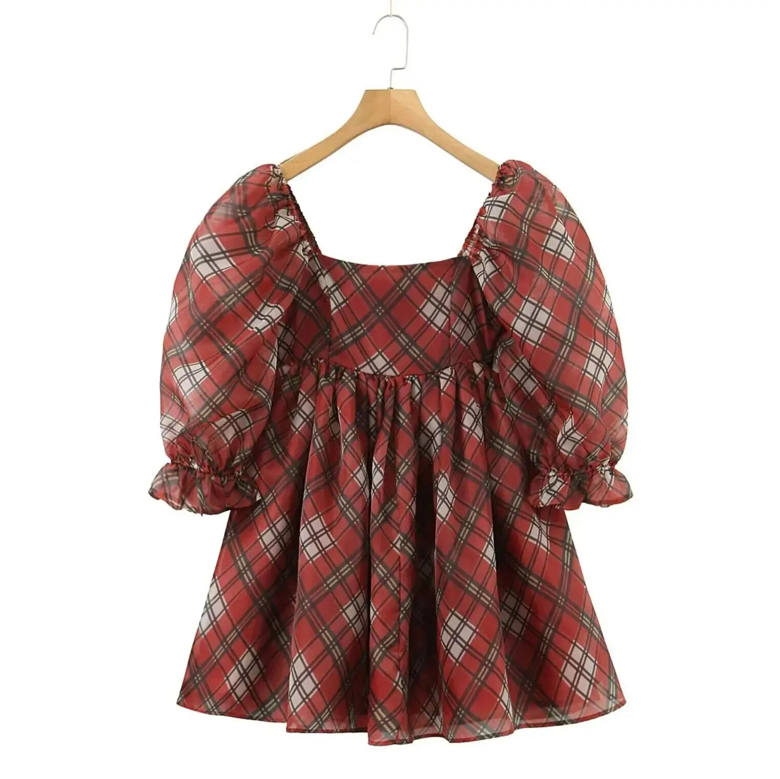Bloggers favs shop liropolla-0 Sleek red plaid Short Sleeve Puff Mini Dress